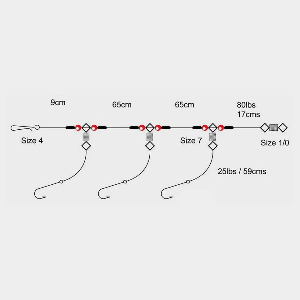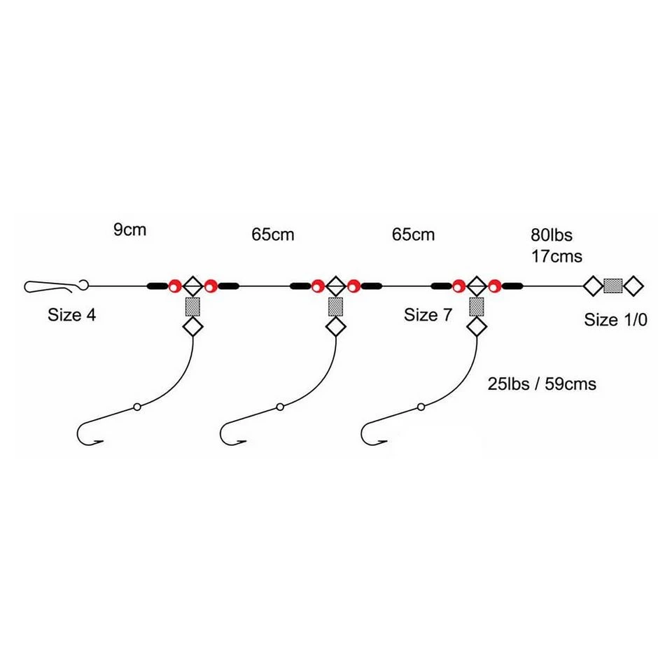 A distance fishing rig with a loop rig design which allows the hooks to be placed behind the lead for maximum streamlining. It also allows for fishing with a much longer bottom snood to be fished – perfect for fishing for rays and flatfish.
